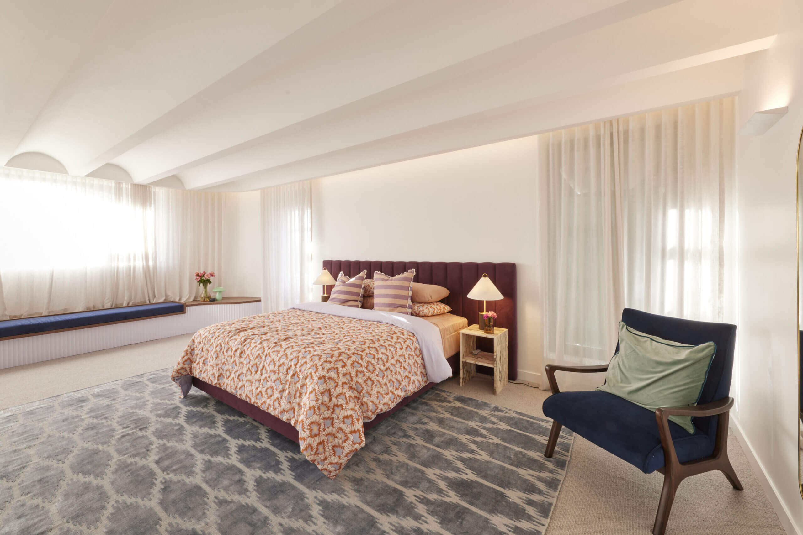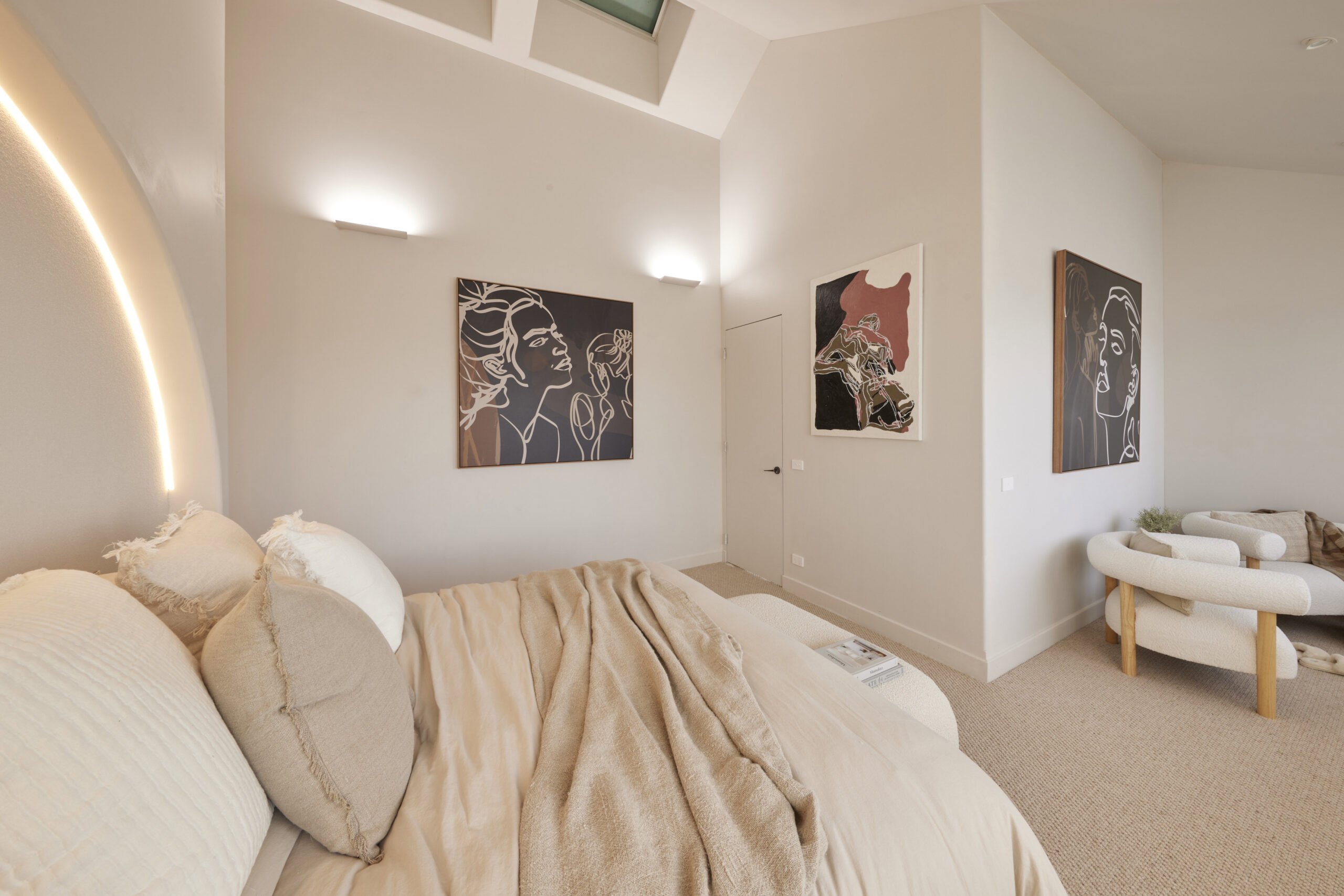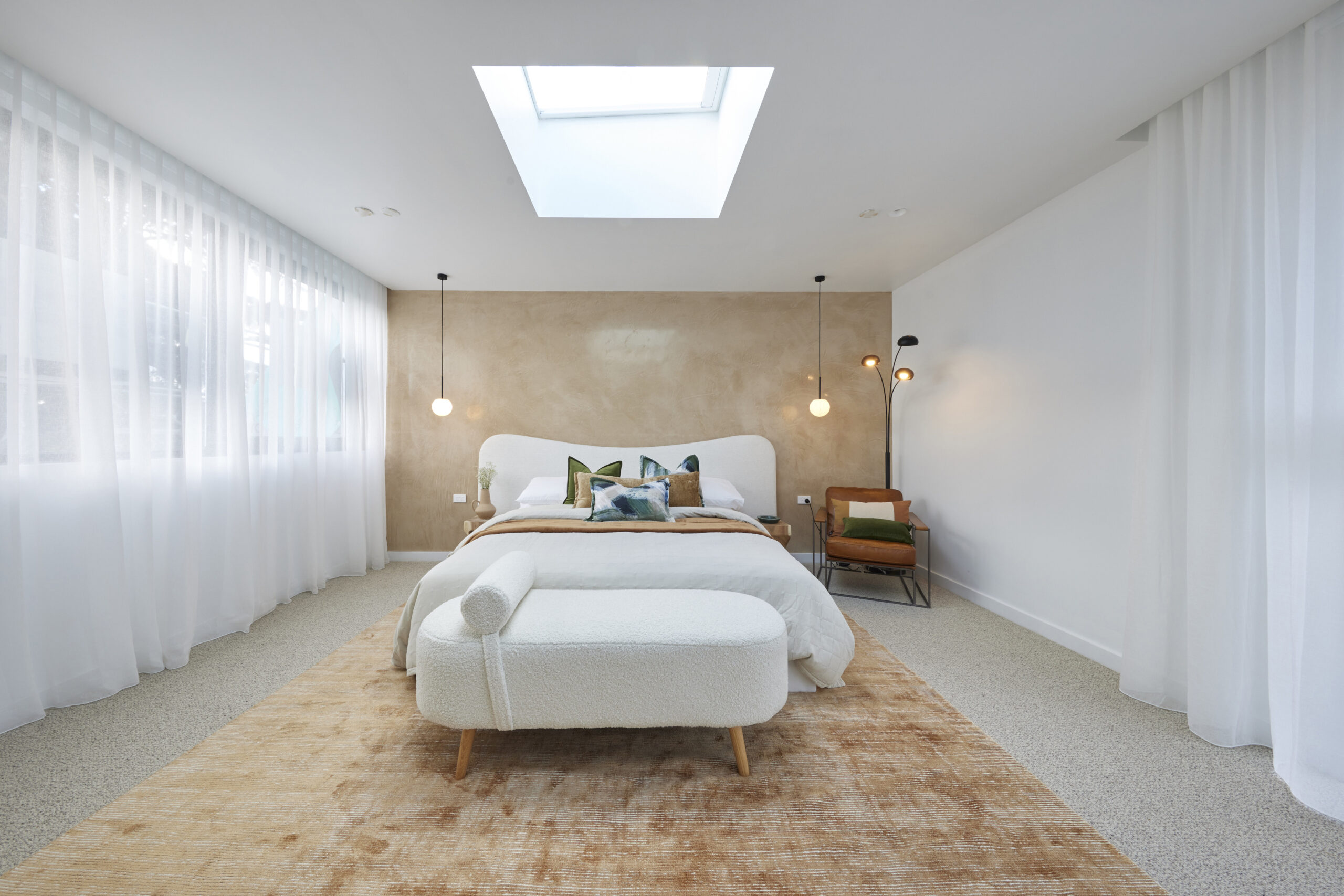 After a week of huge problems with their builders, sisters Eliza and Liberty didn’t quite finish their main bedroom. We did love the fireplace and showstopping artwork they chose, as did judge Shaynna Blaze. Great floorplan too!